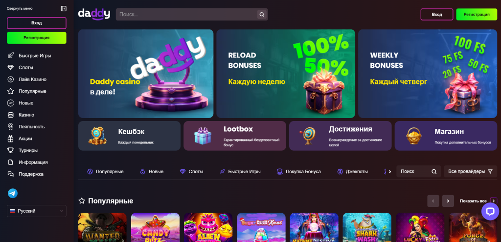 Дэдди казино было запущено в 2023 году. На портале представлены игровые автоматы от известных разработчиков, Live casino и ставки на спорт. Софт качественный, с высоким коэффициентом возврата, оснащен ГСЧ, который отвечает за честную игру.